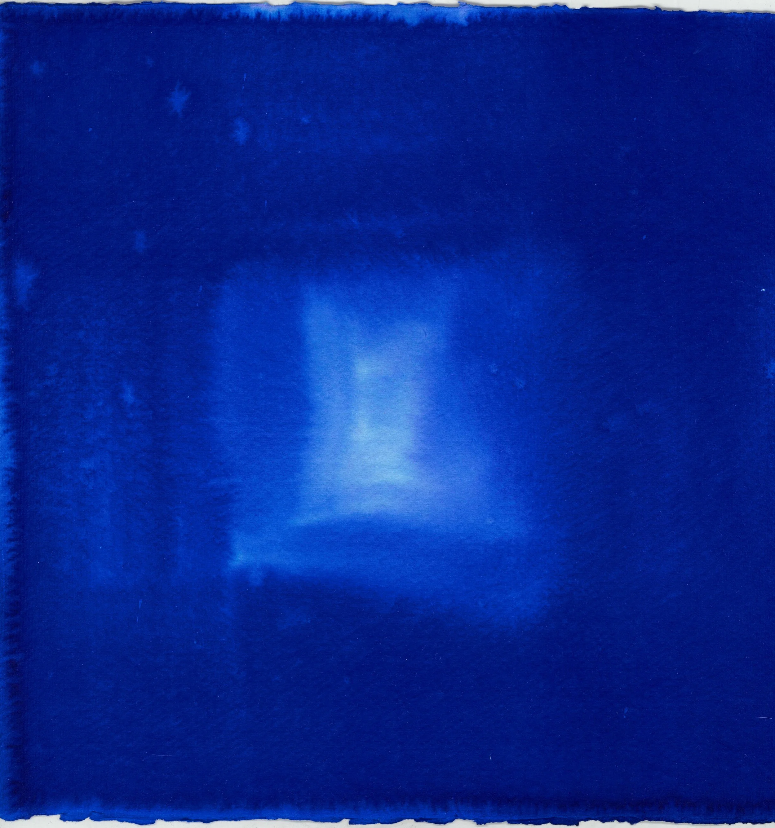 Works made with blue ink spread across the paper through stains, dispersions, and layered movements, establishing a surface that explores the thresholds where forms emerge and dissolve. Color functions less as a means of depiction than as a condition, an environment in which images slowly appear and fade; the horizon emerges here like an object of desire that continually recedes and can never be fully grasped.