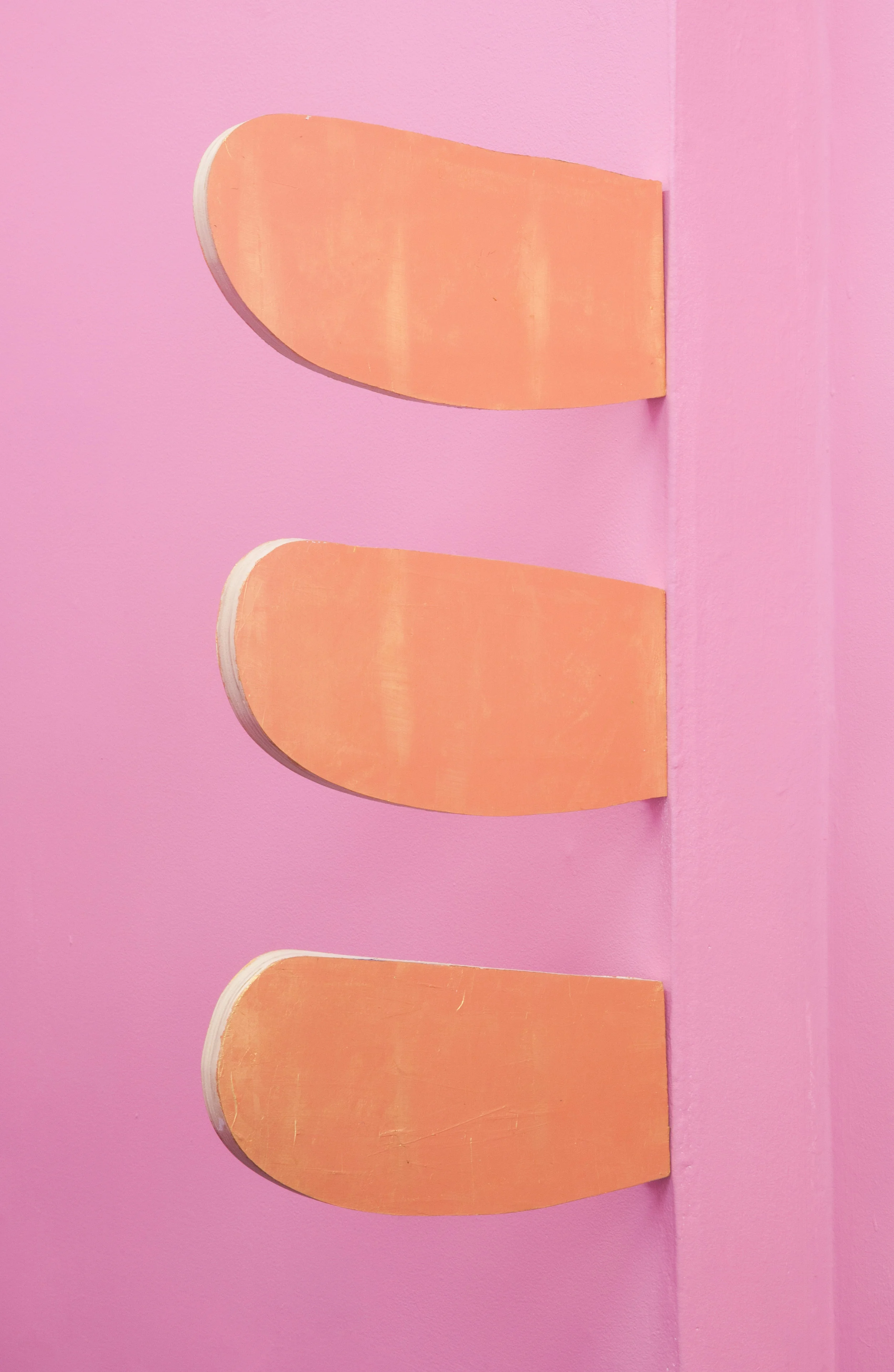 FIERMAN presents A Queer Divine Dissatisfaction (a blessed unrest), a solo exhibition by Chuck Nanney, his first in New York since 2003. The show is comprised of sculptural paintings on wood in irregular and organic shapes. The paintings are colorful and abstract with a cheerful sensibility, adorned with gold leaf and rhinestones, simultaneously showy and humble talismans of Nanney’s pyschic cosmos. The shapes often reference the body – tongues, cocks, legs – and hang at varied heights around the gallery, engendering a sensory interaction that is at once visual and disarmingly physical. The metal door hinges that affix the paintings to the walls contrast their playfulness with a sado-masochistic edge. The gallery itself is entirely painted in Pepto-Bismol pink, for Nanney the “perfect healing pink,” queerly confounding the pop of the paintings with the deeply felt sense of the delicate human body. The queerness lies in the works’ sincerity, its insistence on existing despite its frailties and imperfections, and as such embeds it within Nanney’s lived experience as an HIV positive gay man coming of age in the 1980’s.